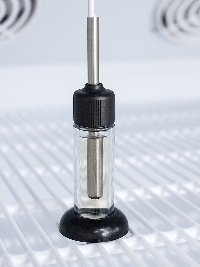 The buffered temperature probe is encased in a glycol-filled bottle to better simulate temperature of the stored product, with an additional sensor that reads air temperature to ensure superior temperature control. The current and min/max temperature display is viewable in Celsius or Fahrenheit to the nearest tenth of a degree. The audible and visual temperature alarm sounds if the unit's interior goes out of range.