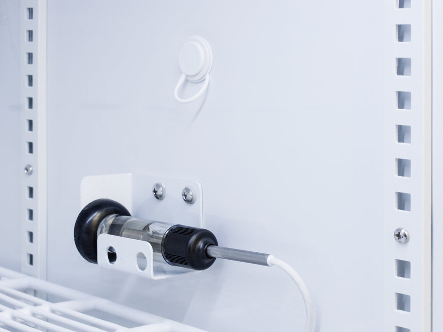 The current and min/max temperature display is viewable in Celsius or Fahrenheit to the nearest tenth of a degree. The audible and visual temperature alarm sounds if the unit's interior goes out of range. Additional alarms include a power failure alert, door open alarm, and sensor failure alarm. This unit is equipped with remote alarm contacts in the rear and a 1/2" probe port on the right side to accept additional monitoring devices. A hospital grade cord with 'green dot' plug is also included for added safety in high traffic areas.