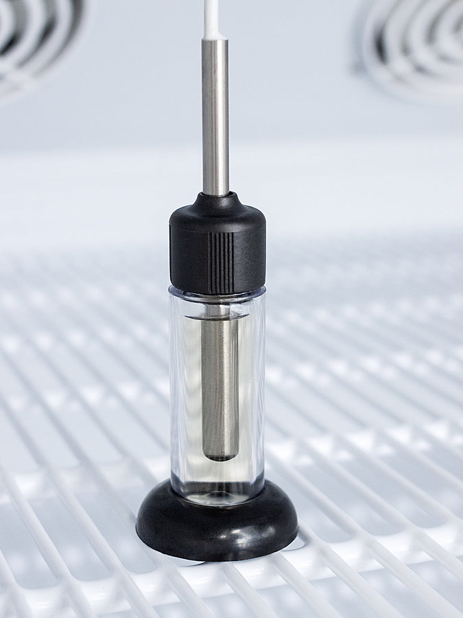 The buffered temperature probe is encased in a glycol-filled bottle to better simulate temperature of the stored product, with an additional sensor that reads air temperature to ensure superior temperature control. The current and min/max temperature display is viewable in Celsius or Fahrenheit to the nearest tenth of a degree.