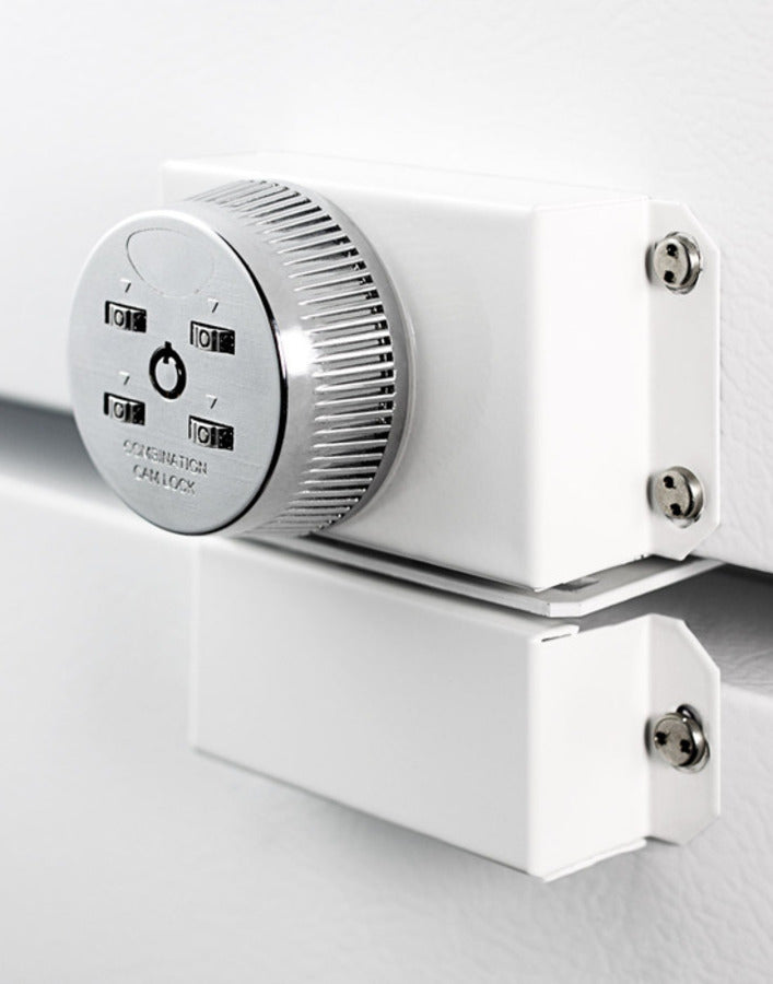 • Combination double lock: Front mounted lock secures both the refrigerator and freezer compartments via combination dial. A key is included to override combination