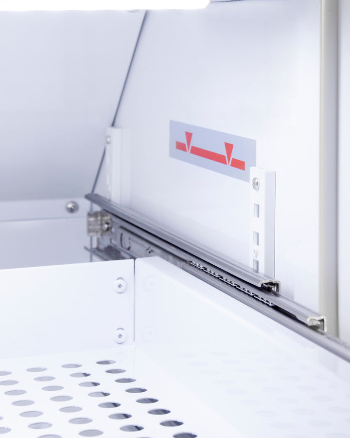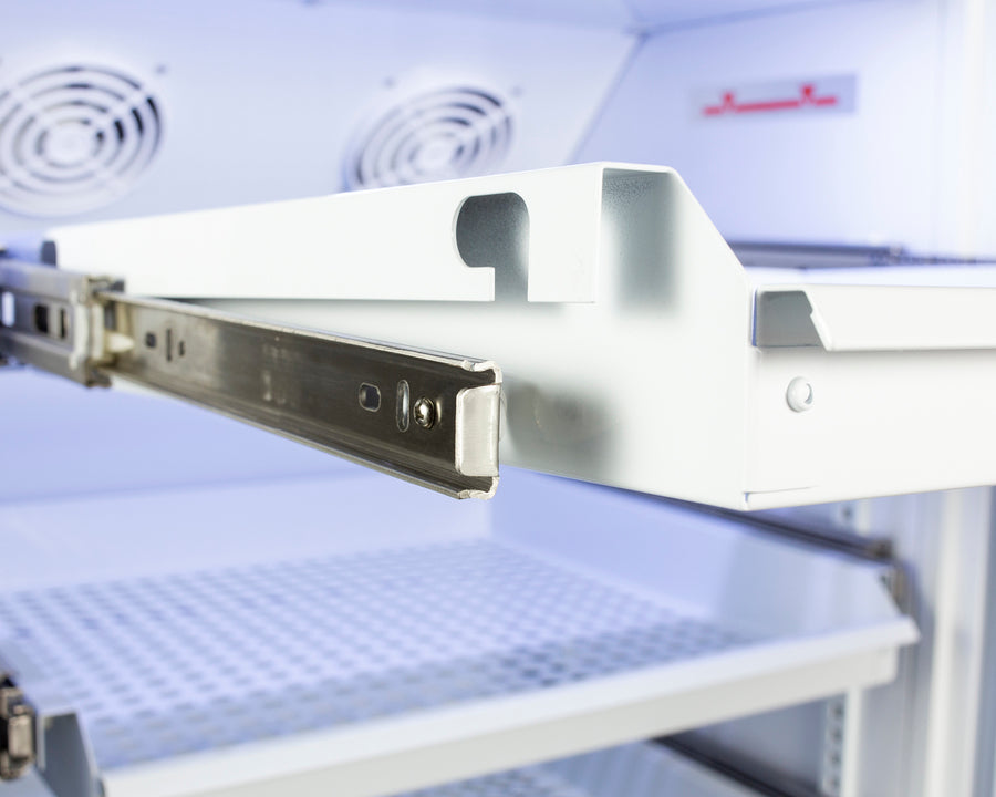 Additionally, each drawer is removable allowing for transport of contents as needed. The drawers also lock into place for added security, while the perforated bottom ensures proper ventilation throughout the unit. LED internal lighting with an on/off rocker switch attractively illuminates the interior for easy viewing. The interior is constructed from white powder-coated metal to ensure added durability and better temperature retention.