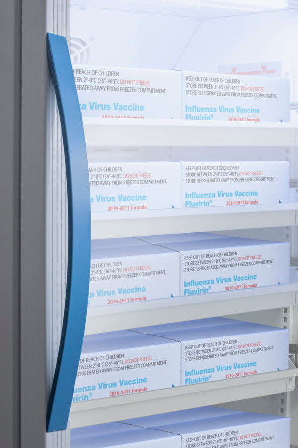 Accucold's Pharma-Vac Performance Series are upright all-refrigerators designed and purpose-built for pharmacy, medication, and vaccine applications to support meeting CDC/VFC guidelines, with a powder-coated silver ion handle that helps prevent germ spread.