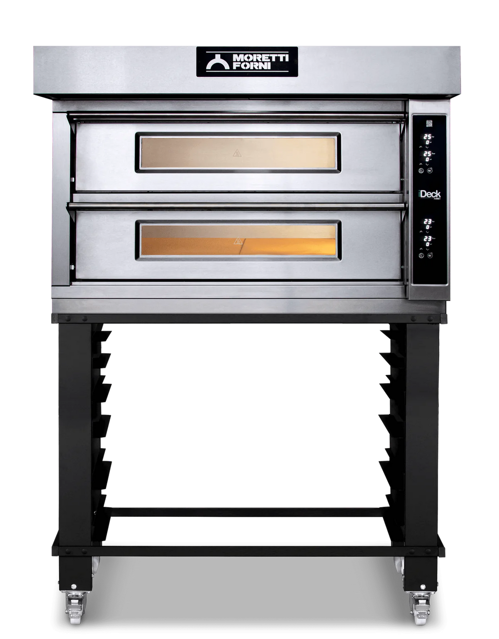 iDeck Pizza Oven, electric, (2) 41"W x 26"D x 5-1/2"H deck, (10) 12" or (4) 18" pizza, (4) 16" x 22" sheet pans capacity, 840°F max operating temperature, dual temp technology, electronic control, (2) stainless steel bottom-hinged door, halogen lighting, refractory brick baking surface, stainless steel external structure, open frame stand with caster included, hood not included, 16.3kW, CE, Made in Italy