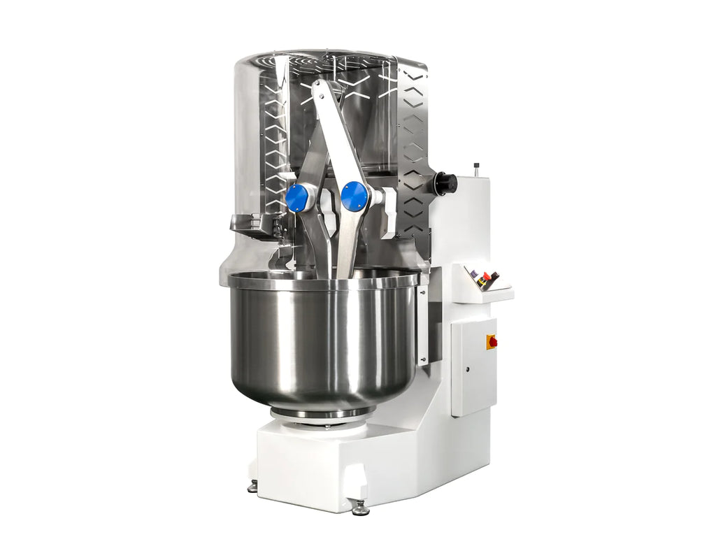 Diving Arm Mixer, 123-1/2 lb dough capacity, variable speed, fixed bowl, manual control of twin arms, timer, stainless steel 21 gallons bowl, tool-holder shaft, and arms, plexiglass bowl cover, white painted steel construction, casters, 1.2/1.8 HP, 208-220v/60/1-ph, 12 amps, Made in Italy