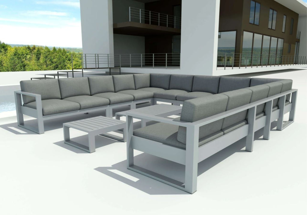 Our Lucca 13 Piece Deep Seating Set has a sophistication and elegance about it that you cannot get with any other collection. This set will be a valuable addition to your patio or backyard space. Seating up to 11; you will be able to have numerous parties, bar-be-ques, and family functions, while having plenty of room for everyone to relax and enjoy. With moveable pieces, you can place pieces in any order, allowing for more than 1 sitting area. Our Montserrat Seating Collection is our high-end outdoor collection made of Premium Teak wood and blended Grit Grey Aluminum Metal for a modernized sleek design. Sunbrella cushions are included with each set. These comfortable cushions are made of a water-repellent material that prevents mildew and fading. Available in 8 colors.
