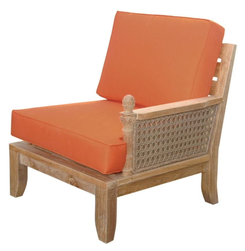 The Luxe Left Modular exhibits classic elegance with intricate detailing that provides deep seating comfort in the luxury of the outdoors. Made of synthetic rattan, the sides of the armchair are intricately designed culminating with a pineapple floral motif that's handcrafted from our expert craftsman of teak wood. Add an ottoman footrest, a coffee table, and additional chairs from the Luxe Modular Set for a complete deep seating set. Includes Sunbrella All-Weather cushions 27" deep and 6" thick from a variety of fabric pattern and color options available. Built from genuine Grade-A Teak sanded smooth without finish, it is the perfect chair for the outdoors.