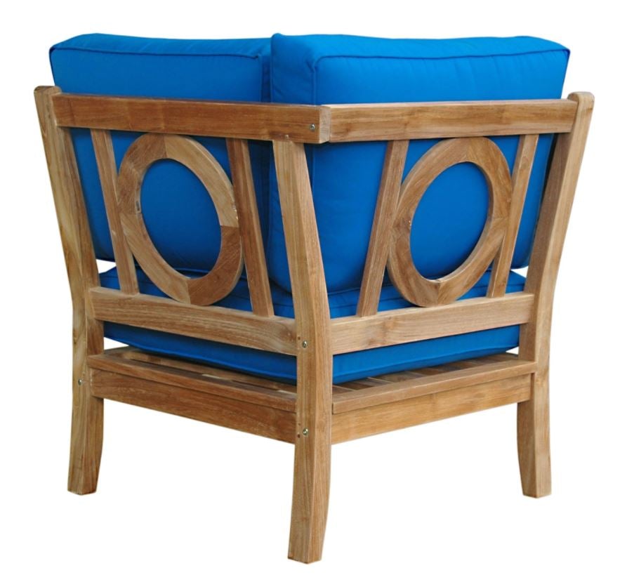 The corner piece of the Natsepa Deep Seating Collection built from Grade-A teak and finished kiln dried features tapered legs, arched back, and the Natsepa circular themed motif. As the corner piece of the set, add the Center Chair, Left Chair, Right chair, Ottoman footrest, a coffee table, and a side table from the Natsepa Deep Seating Collection for a complete deep seating set. Includes Sunbrella All-Weather cushions 27" deep and 6" thick from a variety of fabric patterns and color options. Built from genuine Grade-A Teak sanded smooth without finish, it is the perfect chair for your outdoor needs.
