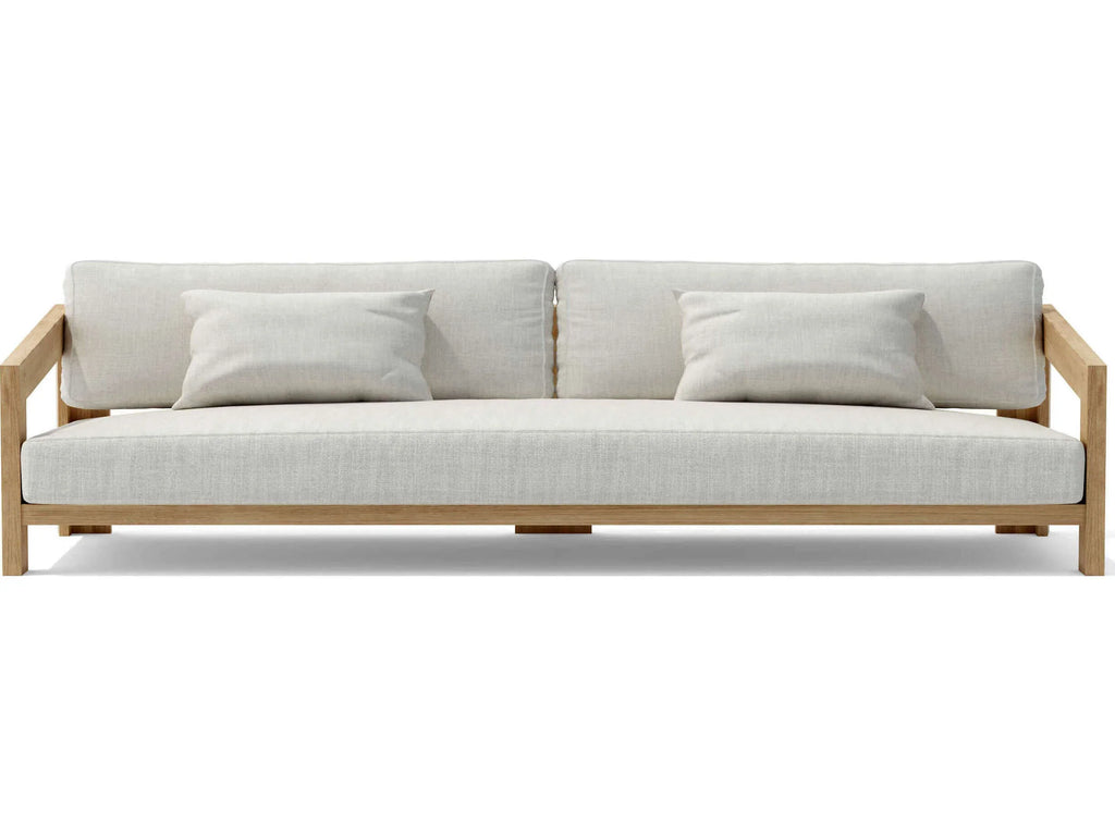 Featuring bold lines and a striking presence this Smyrna 4-Seat Sofa is a well-constructed and fully built deep seating sofa measuring 8 ½ feet in length. Made of premium unfinished teak it includes 5 ½” thick cushions from All-Weather Sunbrella Fabrics with pillows to match.