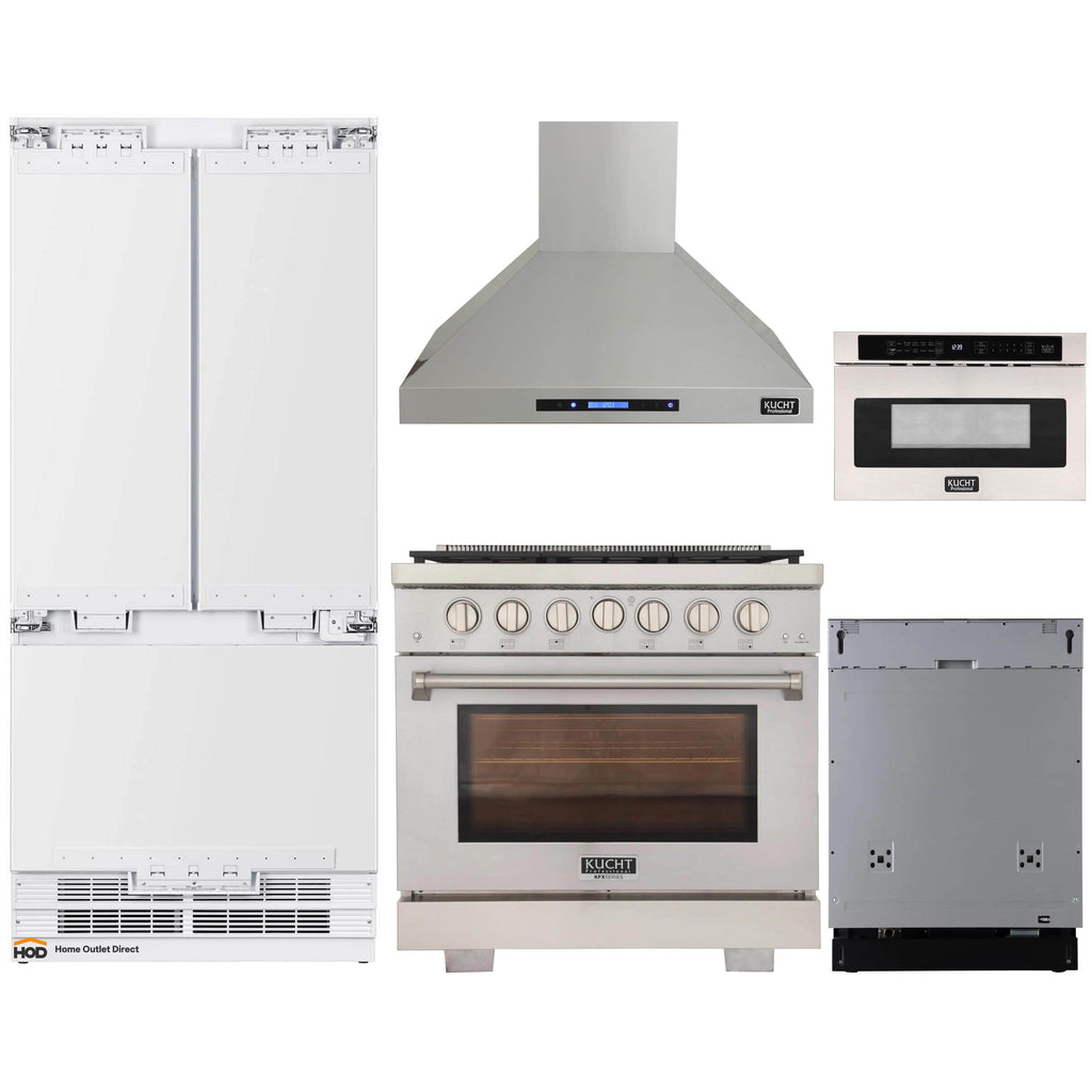 Kucht 5-Piece Appliance Package - 36" Gas Range, 36" Panel Ready Refrigerator, Wall Mount Hood, Panel Ready Dishwasher, & Microwave Drawer