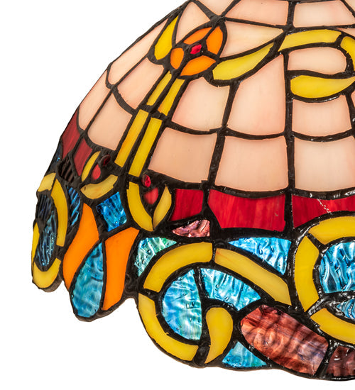 Ideal for a children's bedroom or playroom, this delightful pendant features Purple Blue art glass, with Orange art glass Teddy Bear accented with Red glass jewels. The stained glass shade is created using the famous Meyda Tiffany copperfoil construction. This beautiful art glass shade can be paired with a base to make a table or floor lamp or a stunning wall or ceiling fixture. Each shade is a unique work of art with color variations based on natural ingredients inherent in the glass. Contact us if color matching is critical when ordering multiple items.
