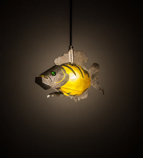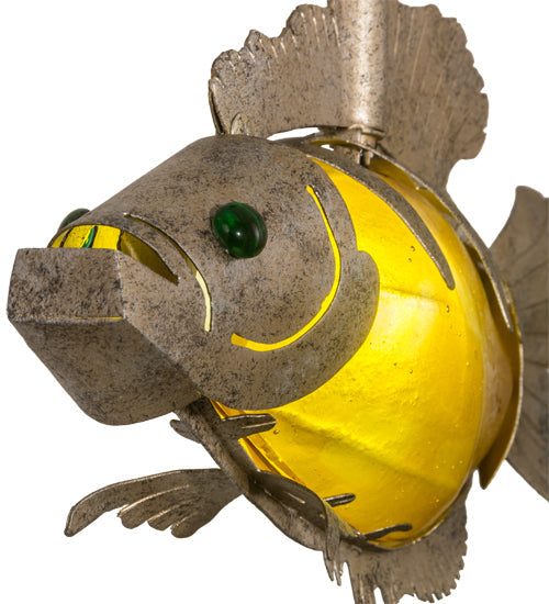Swimming beneath the crystal blue water depths emerges this exquisite fish. Bold stripes are reminiscent of a jungle cat while the frame embodies delicate fins and gills that contrast with the robust head with jaw. The intricate Hand-forged Iron frame highlights Amber fused glass complemented with Corinth finished hardware and Emerald colored glass eyes.