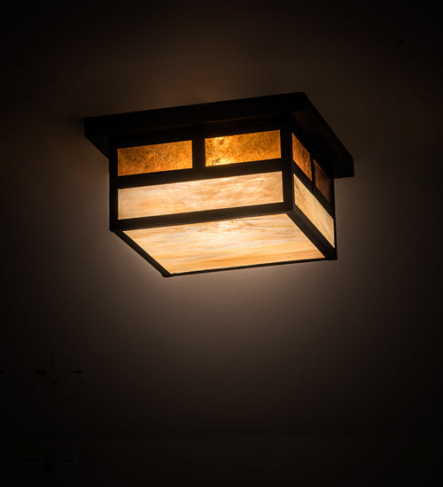 Handcrafted from Solid Brass, this Craftsman Signature fixture is inspired by the Arts and Crafts movement. The striking Mission straight line design is featured in Beige Iridescent glass with Amber Mica accents and enhanced with a frame and hardware finished in a handsome Craftsman Brown. Handcrafted by highly skilled artisans in our 180,000 square foot manufacturing facility in Upstate NY. Custom sizes, styles, colors and dimmable energy efficient lamping options are available. The 12-inch square ceiling fixture is UL and cUL listed for dry and damp locations.