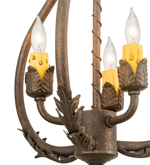 Exquisite styling and luxurious charm are reflected in the Antonia Chandelier. The fixture features faceted crystal charms, scroll arms, Acanthus leaves and Gilded Tobacco finished hand-forged hardware. 3 Amber faux candlelights deliver beautiful ambient illumination.