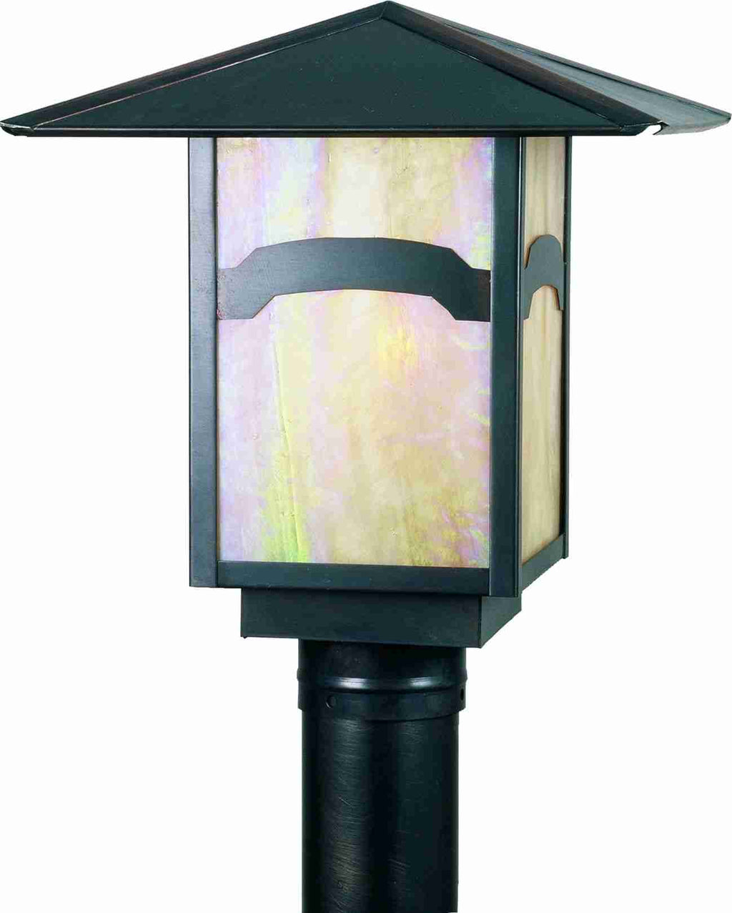 An Arts and Crafts Mountain View recurved bar accents this handsome American Craftsman lantern style post mount. The fixture, handcrafted in the USA by Meyda artisans, is finished in Craftsman Brown and has Iridized Beige glass panels.
