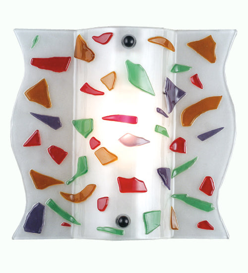 Colorful chips of Green, Purple, Yellow Red and Orange glass make the Dino, Metro Fusion ADA compliant wall sconce. Pieces of glass are fused to this unique shade and heated again to shape. This fun sconce shade is suspended by Nickel finished powder coated hardware. Designed and created by Meyda artists and craftsmen, for a unique, contemporary fixture.