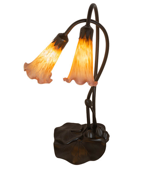 One of the most popular Louis Comfort Tiffany styled lamps on the market today, recreating his famous Favrile design from the early 1900's. This mottled Amethyst tipped Amber shaded Two Light Accent Lamp offers an attractive, delicate design featuring shades mouth blown of fine art glass. Lily shades are suspended from stems delicately winding above Lily pads bases finished by hand in Mahogany Bronze.