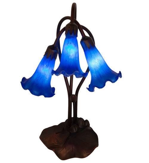 One of the most popular Louis Comfort Tiffany styled lamps on the market today, recreating his famous Favrile design from the early 1900's. This softly mottled Indigo Blue shaded 3 Light Accent Lamp offers an attractive, delicate design featuring shades mouth blown of fine art glass. Lily shades are suspended from stems delicately winding above a Lily pad base finished by hand in Mahogany Bronze.