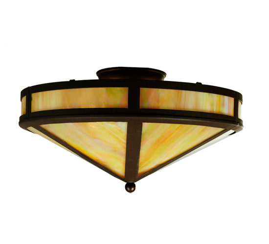 This handsome mission style flushmount is finished in Cafe Noir and has Beige iridized art glass panels. Handcrafted in our 180,000 square foot manufacturing facility in Yorkville, New York at the foothills of the glorious Adirondack Mountains. Custom choices include various designs, finishes, and sizes. Dimmable energy efficient lamping options offered. UL and cUL listed.