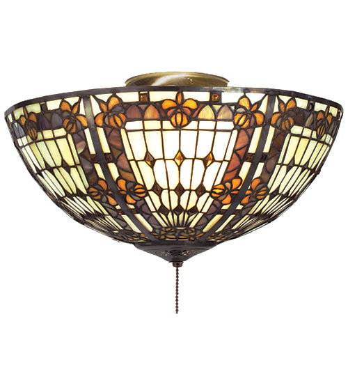A Meyda Tiffany original design, the Fleur-de-lis is an intricate design of stylized Honey Fleur-de-lis and Amber colored glass jewels on a Beige background. Reminiscent of castle and cathedral glass, the Fleur-de-lis pattern holds a prominent place in European Heraldry. The stained glass shade which is handcrafted utilizing the famous Meyda copperfoil construction process.The hardware is hand finished in Mahogany Bronze. Custom options are available. The sconce is UL and cUL listed.