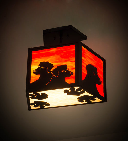 This charming ceiling fixture features Labrador Retriever dogs on Sunburst colored art glass side panels and paw prints on the Beige art glass bottom diffuser. The fixture is enhanced with a frame, hardware and decorative accents in a Solar Black finish. Custom crafted in the Meyda facility in Yorkville, NY, the flushmount available in custom styles, colors and sizes, as well as dimmable energy efficient lamping options such as LED. The fixture is UL and cUL listed for damp and dry locations.