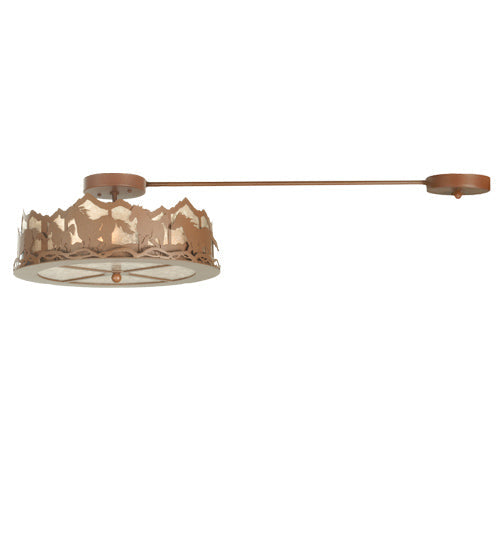 Running Horses are featured galloping on the prairie on this handsome inverted ceiling fixture. Beautiful ambient lighting is projected through Silver Mica panels and hand finished in Rust. The fixture is custom mounted with two ceiling canopies as the junction box is not directly above the fixture. Available as is or we can customize for your unique wiring challenge. Made to Order in our 180,000 square manufacturing facility in Yorkville, New York, at the foothills of the Adirondack Mountains. Shade colors, metal finishes and fixture sizes can be customized to your needs. UL and cUL listed for dry and damp locations.