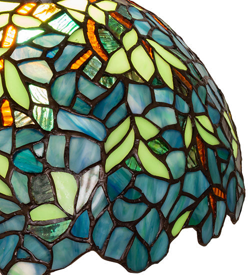 Imagine wandering under darkening skies; past the deepening blooms and climbing vines of the Wisteria shrubbery as you prepare for a restful night of welcome slumber. This beautiful table lamp is created with Blue; Green and Blue/Green art glass using the famous Meyda Lighting Tiffany copperfoil construction process.