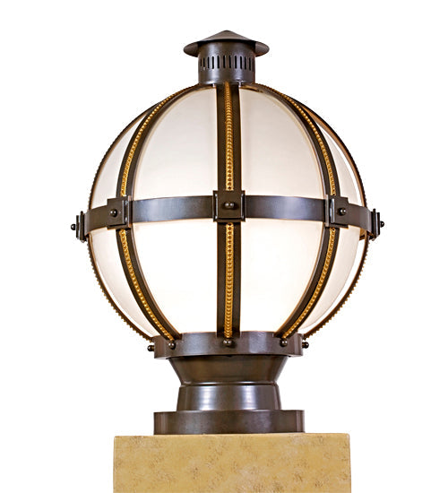 Orbital is a unique handsome indoor/outdoor lighting design. A Frosted Clear Glass spherical diffuser is embraced by a Chestnut finished band which is enhanced with matching ribbons highlighted with Gold beaded filigree. A vented rooftop styled finial crowns this luminaire which sits on a three tiered base. This versatile fixture mounts directly to decks, piers and decorative columns. Custom crafted in our 180,000 square foot manufacturing facility in Yorkville, NY. Available in custom sizes, finishes and styles. Dimmable energy efficient lamping options are offered. UL and cUL listed for dry, damp and wet locations.