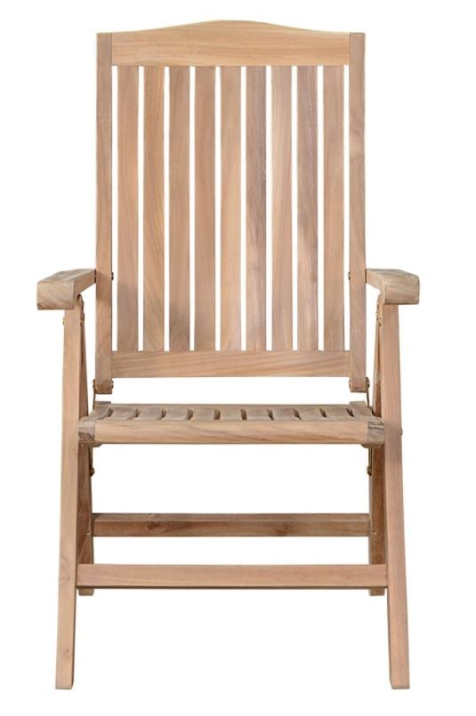 The Katana Five-Position Reclining Chair is easily adjusted from an upright dining position to a relaxed reading position to a reclined position to suit your pleasure. The chairs also folds easily for moving and storing so you can accommodate guests when you need to and hide the set when you don't. With a 5-position adjustment, our recliners are very comfortable and versatile. A simple ratchet action makes adjustment quick and easy. Made from genuine grade teak, it is sanded smooth without any finish in its natural form and color.