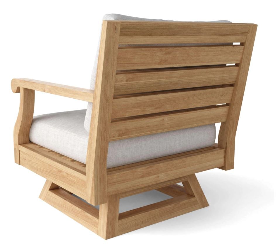 The Riviera Swivel Armchair is a standout piece of furniture that blends deep seating comfort with swivel functionality. At first glance, its considerable size and quality built frame becomes apparently noticeable complementing its stylish curved design and armchair whorl. Add other pieces from the Riviera Luxe Deep Seating set as coffee tables, couches, ottomans, and chairs, or use individually as a single piece to complement any décor or area. Constructed with Premium Teak wood natural unfinished. Swivel functionality up to 360 Degrees for comfort. Sunbrella Cushions and color choice included. Be sure to speak with your representative.