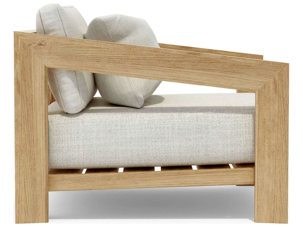 Featuring bold lines and a striking presence the Smyrna Lounge Armchair is a well-constructed and quality built deep seating armchair perfect for the home or outdoors. Made of premium grade unfinished teak it includes 5 ½” thick cushions and two pillows from All-Weather Sunbrella Fabrics. Take a seat in luxurious comfort as the spacious seating measuring 34” x 33” indulges you in. As part of the Smyrna Collection, be sure to add the Smyrna Sofa, Coffee Table, Sun Lounger, Dining Table and Dining Armchair.