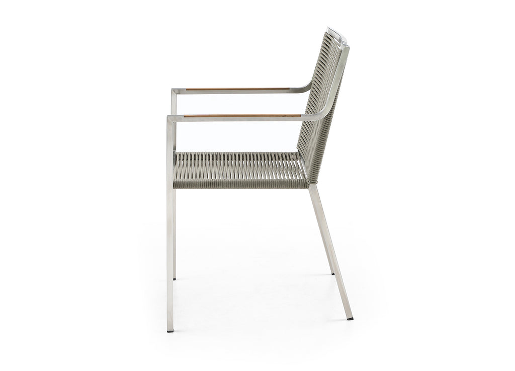 Rhea Outdoor Dining Armchair, Structure, and Legs in Silver Stainless Steel, Armrests in Teak Wood, Seat, and Back in Light Brown Weaving Rope.