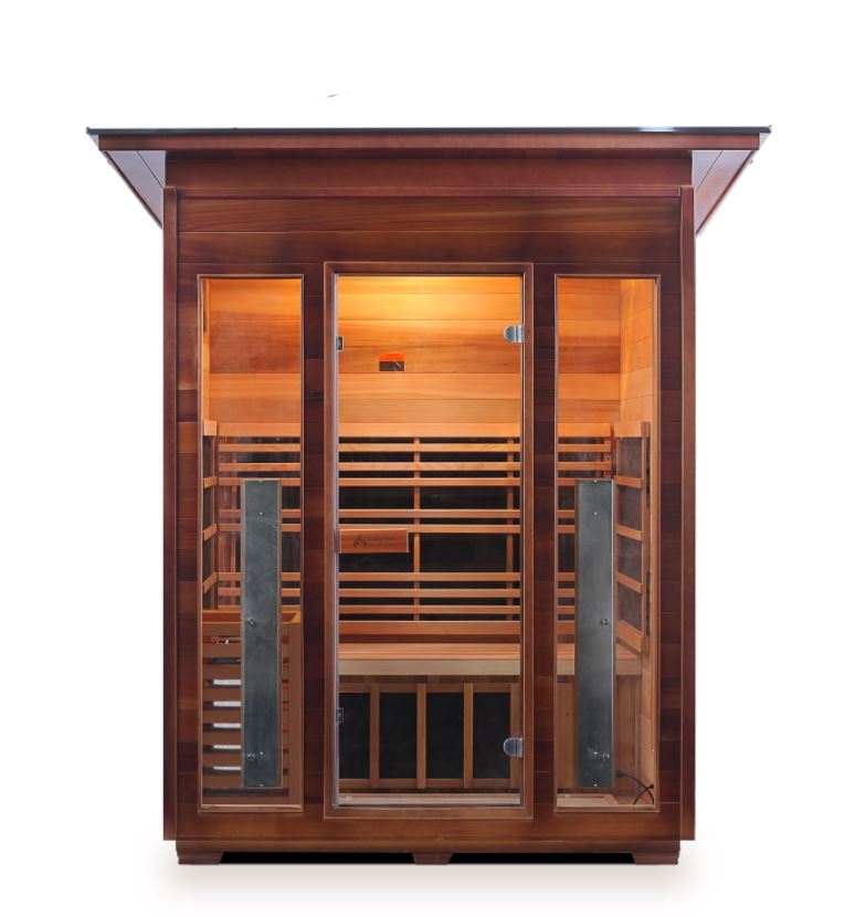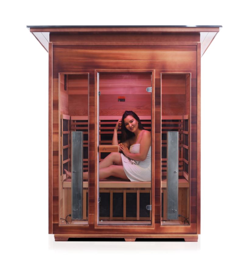 This indoor sauna can seat three people comfortably in a splendid natural Canadian red cedar wood interior. As a hybrid sauna, it uses Harvia electric heaters to increase the temperature of the air, and infra-red lamps to penetrate the skin to heat the body directly. That heat triggers certain mechanisms in the body that bring a load of health benefits and improve the mood.