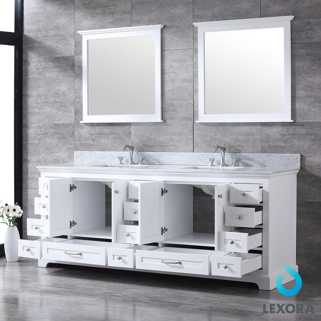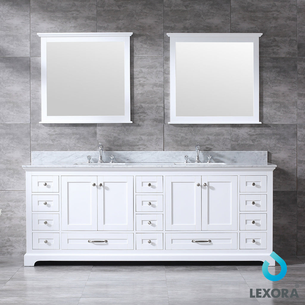 Lexora Dukes 84" White Double Vanity, White Carrara Marble Top, White Square Sinks and 34" Mirrors w/ Faucets LD342284DADSM34F