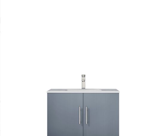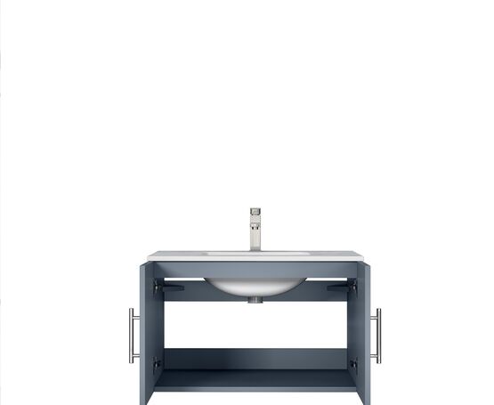 The wall-mounted Geneva vanity ensemble in dark grey from Lexora is a beautiful blending of postmodern style and sensible functionality. Its simple, box-like design is complemented by a marble countertop that lends hints of classical style. When mounted on the wall, the Geneva vanity leaves ample space beneath for additional storage—ideal for bathrooms with limited space.