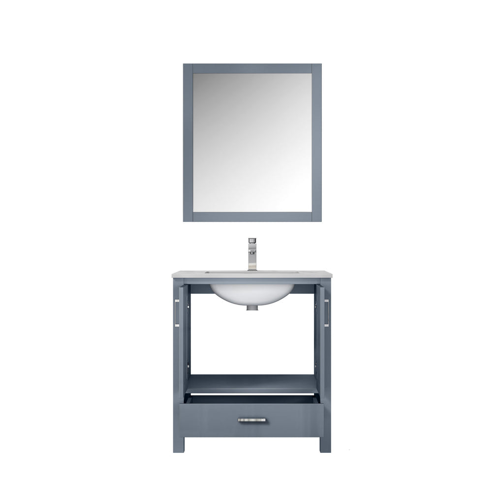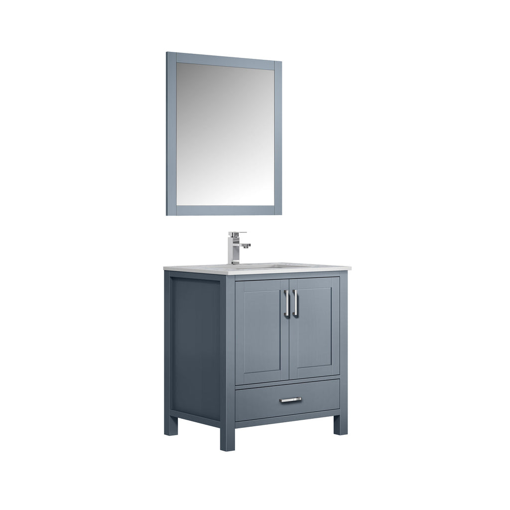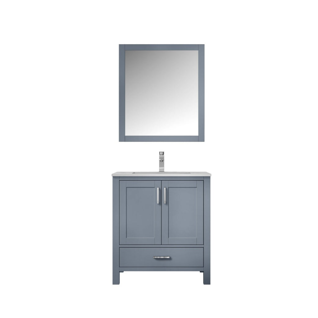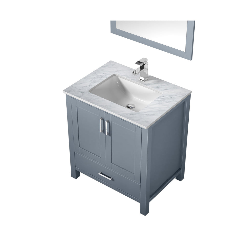 Lexora Jacques 30" Dark Grey Single Vanity, White Carrara Marble Top, White Square Sink and 28" Mirror w/ Faucet LJ342230SBDSM28F