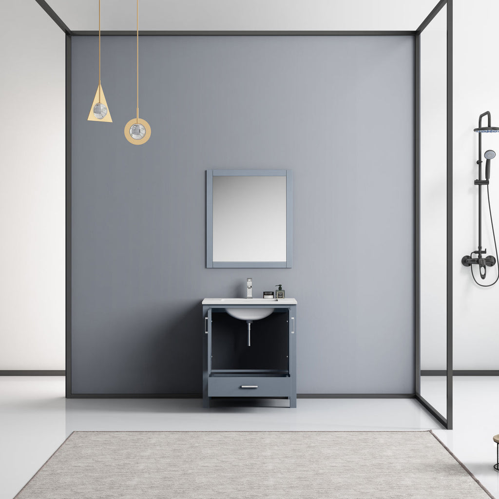 The Jacques vanity ensemble in dark grey from Lexora provides a beautiful, contemporary style to any bathroom. With sleek, clean lines and a cool, neutral finish, this vanity's beauty is only matched by its seamless functionality. The cabinet door and drawers feature soft-close hinges and slides to increase safety and ensure you never have to hear a slamming cabinet again. With solid birch and rubber wood construction, this piece is as durable as it is stunning. The Jacques vanity also comes in different sizes and other finishes to fit into any size bathroom and blends with any style. Every vanity ensemble also includes a matching stone countertop, ceramic undermount sink, faucet, pop-up drain, p-trap and a mirror with matching wood frame, making it the one package you need to finish off your bathroom upgrade.