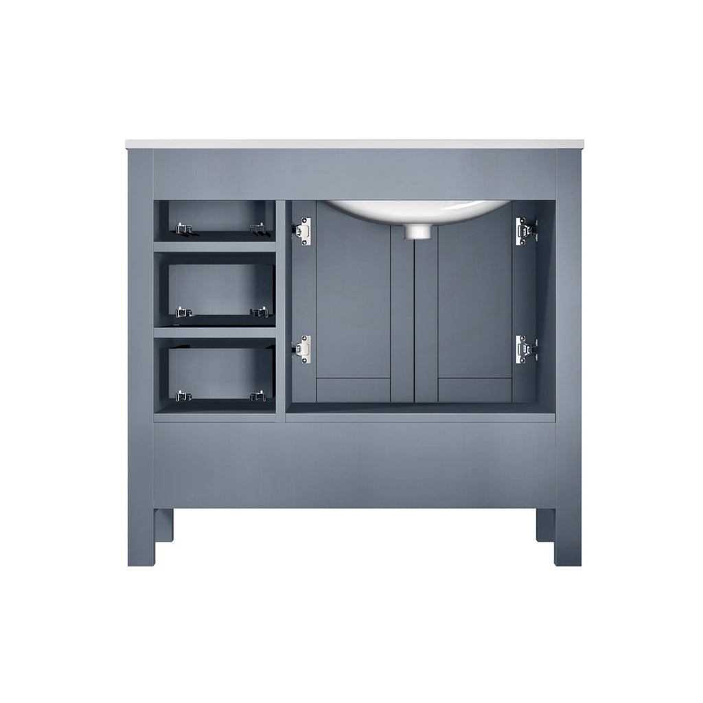 Lexora Jacques 36" Dark Grey Single Vanity, White Carrara Marble Top, White Square Sink and 34" Mirror w/ Faucet - Left Version LJ342236SBDSM34F-L