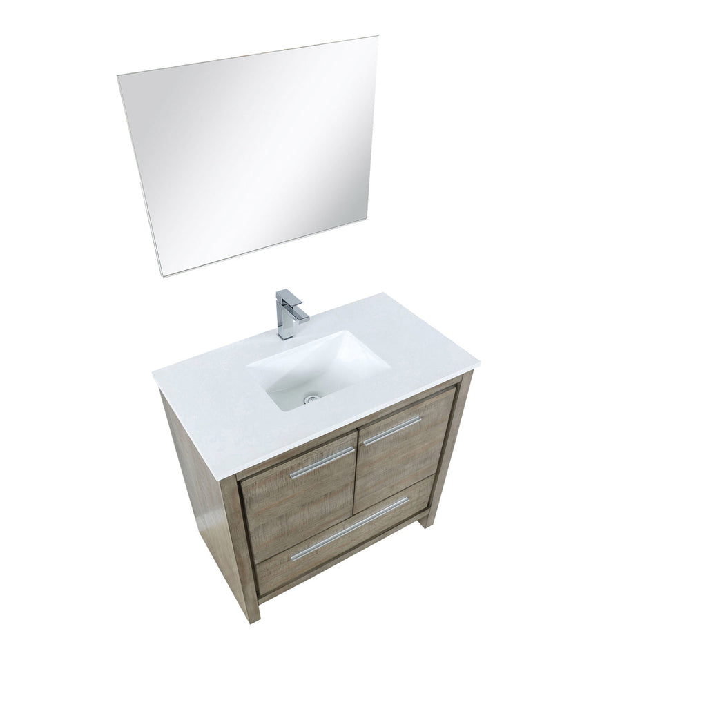 Lexora Lafarre 36" Rustic Acacia Bathroom Vanity, White Quartz Top, White Square Sink, Labaro Brushed Nickel Faucet Set, and 28" Frameless Mirror LLF36SKSOSM28FBN