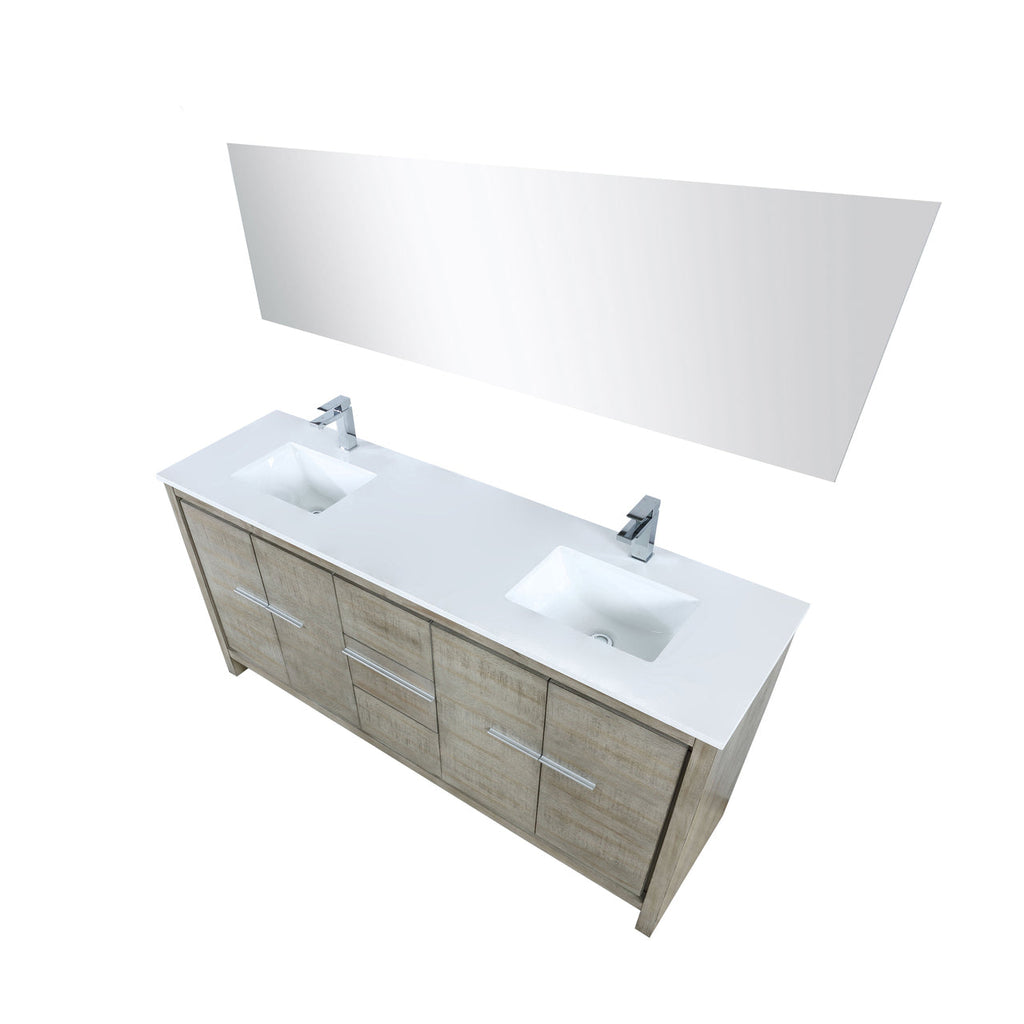 Lexora Lafarre 72" Rustic Acacia Double Bathroom Vanity, White Quartz Top, White Square Sinks, Labaro Rose Gold Faucet Set, and 70" Frameless Mirror LLF72DKSODM70FRG