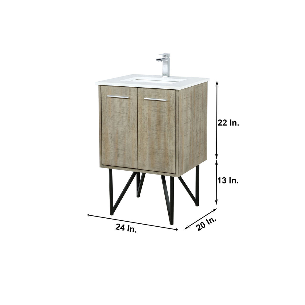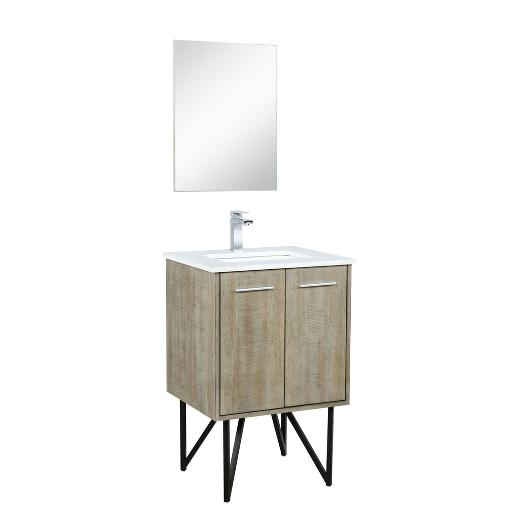 Lexora Lancy 24" Rustic Acacia Bathroom Vanity, White Quartz Top, White Square Sink, Balzani Gun Metal Faucet Set, and 18" Frameless Mirror LLC24SKSOSM18FGM