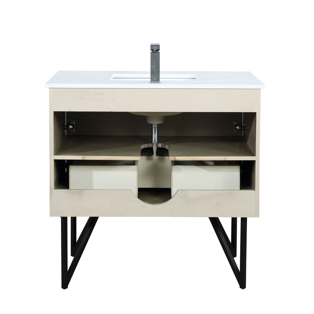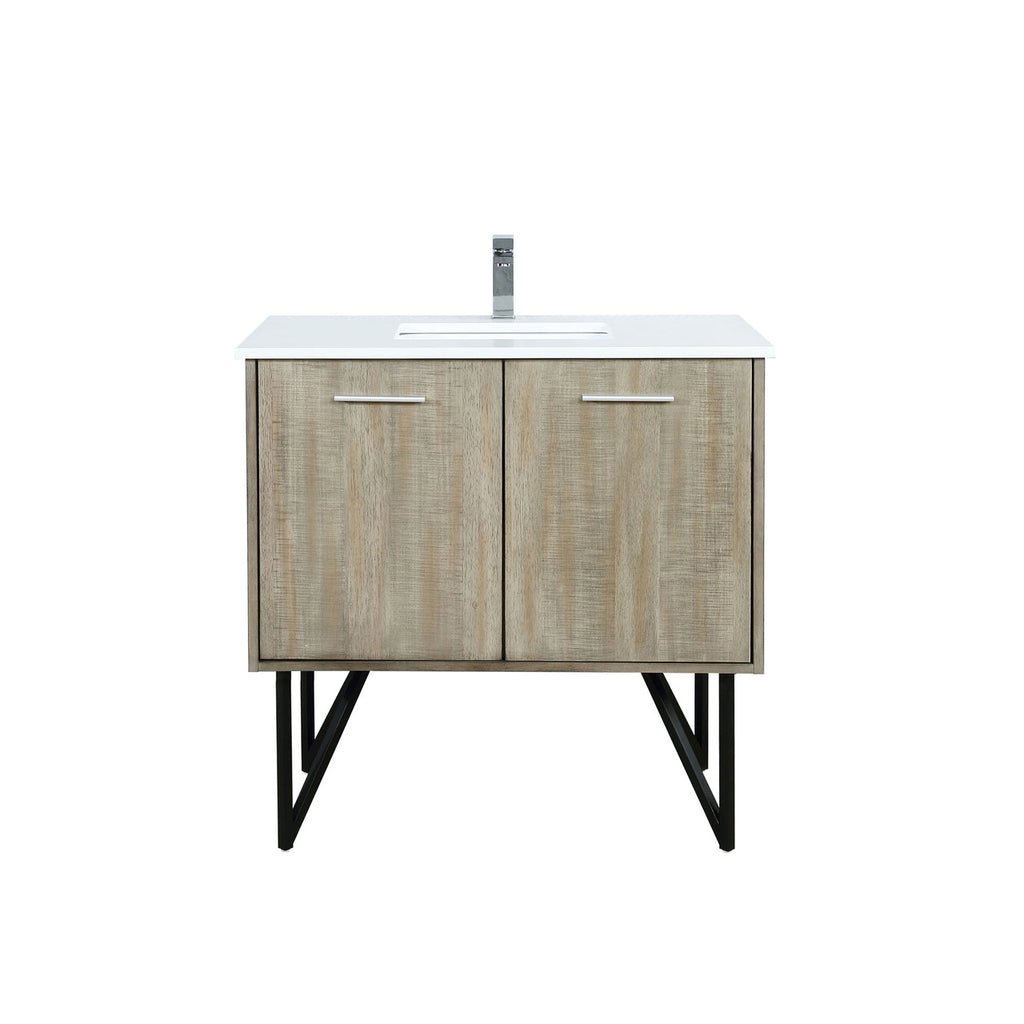 Lexora Lancy 36" Rustic Acacia Bathroom Vanity, White Quartz Top, White Square Sink, and Labaro Brushed Nickel Faucet Set LLC36SKSOS000FBN