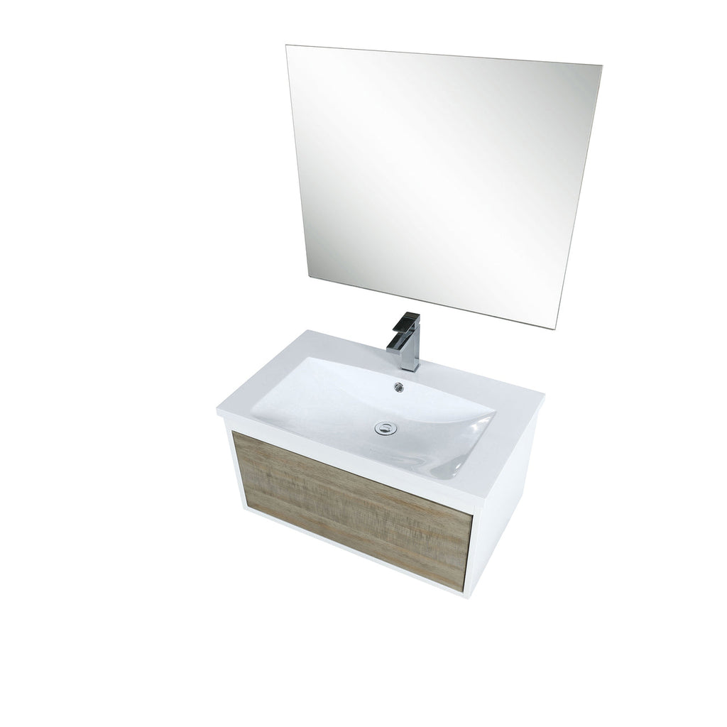 Lexora Scopi 30" Rustic Acacia Bathroom Vanity, Acrylic Composite Top with Integrated Sink, Labaro Rose Gold Faucet Set, and 28" Frameless Mirror LSC30SRAOSM28FRG