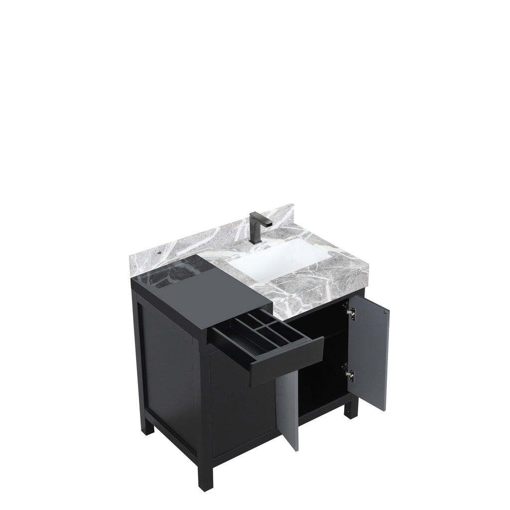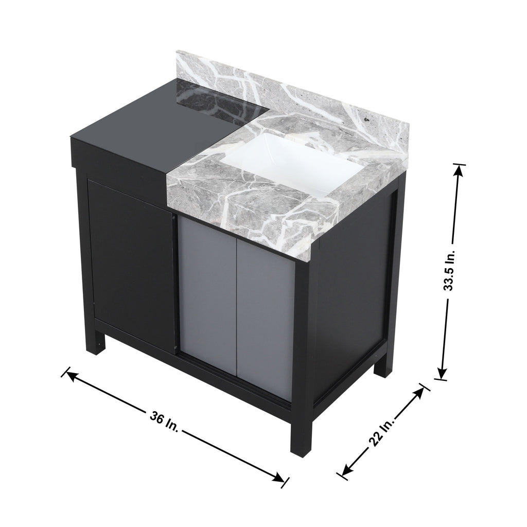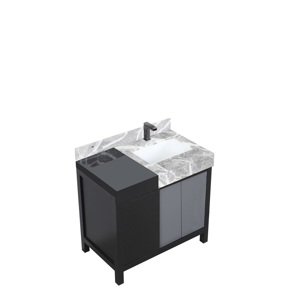Lexora Zilara 36" Black and Grey Vanity, Castle Grey Marble Top, White Square Sink, and Balzani Gun Metal Faucet Set - LZ342236SLISFBG