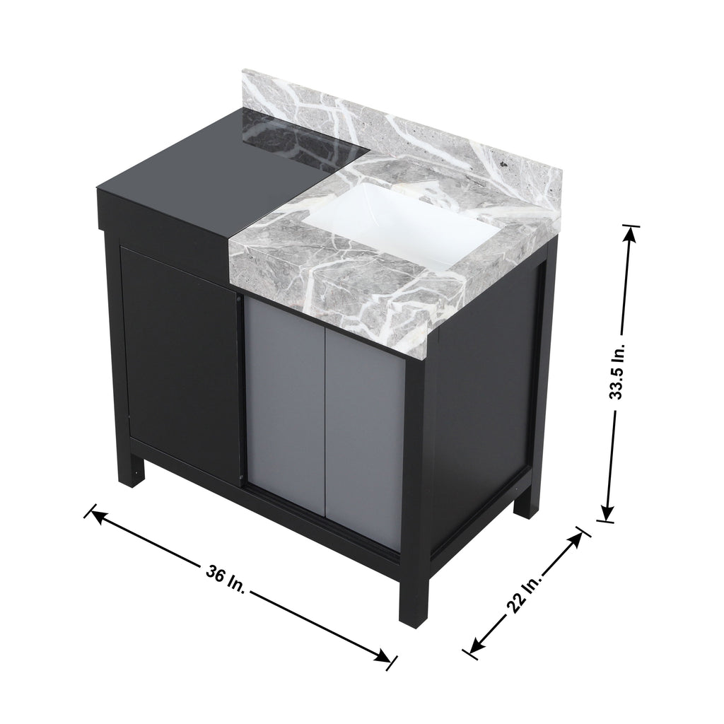 Lexora Zilara 36" Black and Grey Vanity, Castle Grey Marble Top, White Square Sink, Balzani Gun Metal Faucet Set, and 30" Frameless Mirror - LZ342236SLISM30FBG