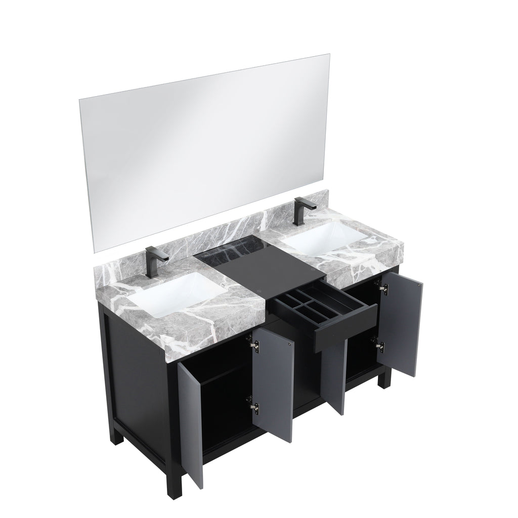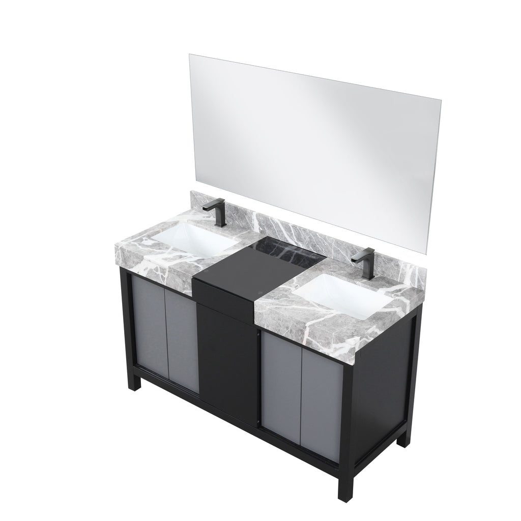 Lexora Zilara 55" Black and Grey Double Vanity, Castle Grey Marble Tops, White Square Sinks, Balzani Gun Metal Faucet Sets, and 53" Frameless Mirror - LZ342255SLISM53FBG