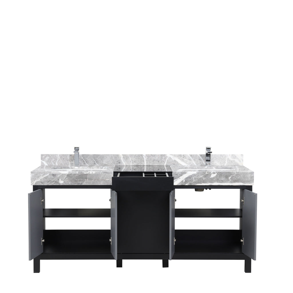 Lexora Zilara 72" Black and Grey Double Vanity, Castle Grey Marble Tops, White Square Sinks, and Monte Chrome Faucet Set - LZ342272DLISFBG