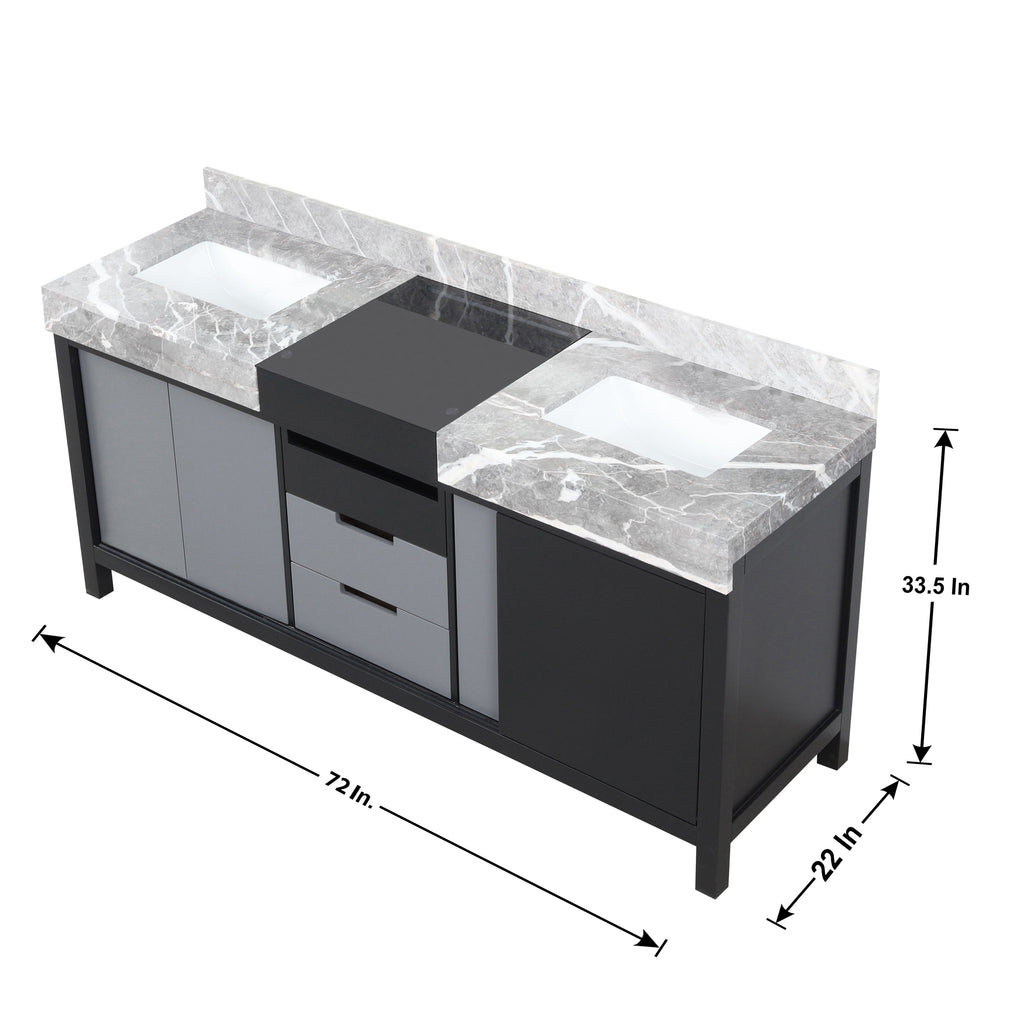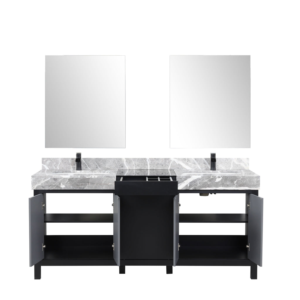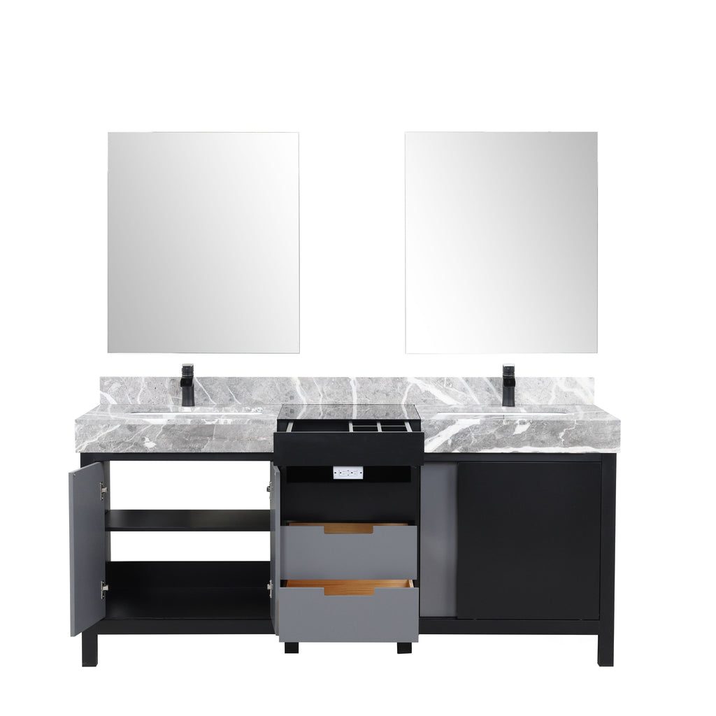 Lexora Zilara 72" Black and Grey Double Vanity, Castle Grey Marble Tops, White Square Sinks, Balzani Gun Metal Faucet Set, and 28" Frameless Mirrors - LZ342272DLISM28FBG