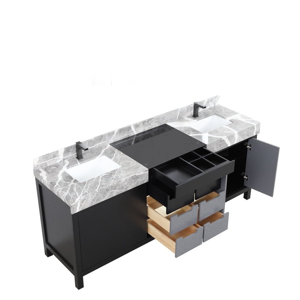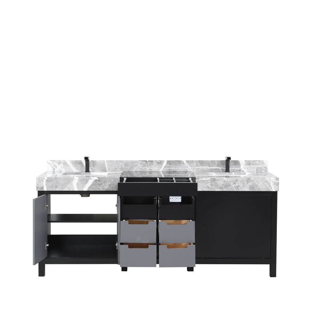 Lexora Zilara 80" Black and Grey Double Vanity, Castle Grey Marble Tops, White Square Sinks, and Balzani Gun Metal Faucet Set - LZ342280DLISFBG