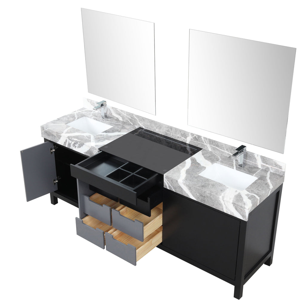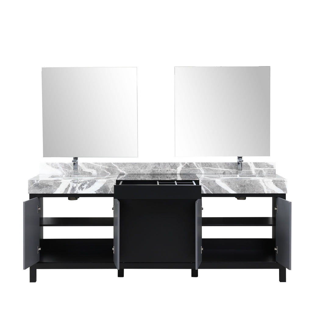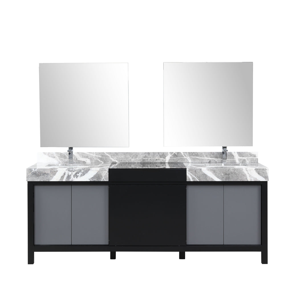 Lexora Zilara 84" Black and Grey Double Vanity, Castle Grey Marble Tops, White Square Sinks, Monte Chrome Faucet Set, and 34" Frameless Mirrors - LZ342284DLISM34FBG