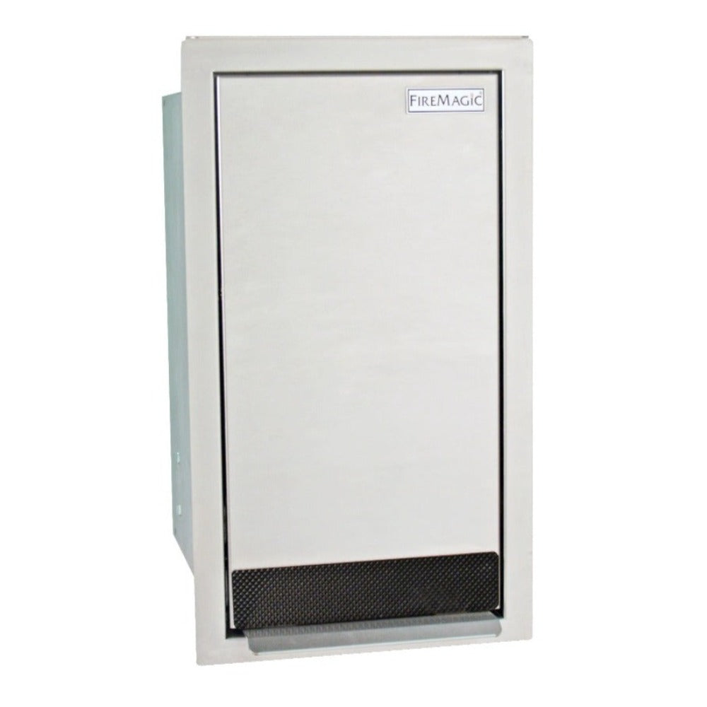 Constructed of stainless steel with a hands-free foot lever, the door easily slides open to reveal a 10.5-gallon trash can.  Fully enclosed.